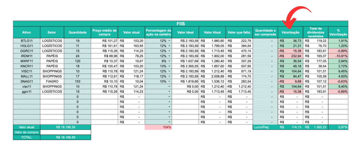 Faça essa análise pela planilha! Ela possui gráficos de alocação que irão te ajudar a saber as porcentagens exatas que você tem em cada investimento. Seja ações, Fundos Imobiliários ou Stocks.